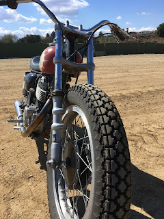 Here is one of the great bikes that greeted me when I arrived at the track. It was another perfect weather Wednesday for getting out and turning some laps. This is mid-70's Triumph 750 twin outfitted for riding Flat Track. It belongs to a guy named Mark Walters, another one of the great people I've met thanks to deciding to give Flat Track a go. Mark waved me down once to give me some pointers as it was obvious that I was a new at this go fast, turn left thing. Small changes lead to be differences in feel and Mark's pointers helped me to get in a good set of laps. Laps were on the menu for the day. I must have done 110-120 laps on that track in the quest to get as much seat time as I can.Mark took this pic of me so that I could get a look at my form in the corners. The bike in the background is an older Yamaha SR500 from the seventies piloted by a quick female rider that went around me with the ease of someone used to going fast. She was half of the duo that were the other track rats getting their Flat Track fix on that day. With Mark in their combined pit area was Go and Masumi Takamine of Brat Style Custom Bikes. Go is a custom bike builder from Tokyo, Japan. I am familiar with Go's bikes from the Japanese custom bike magazines and have known about his work for the last few years. His style of bike has become its own genre of custom. It is defined by a simple, functional style with an emphasis on removing parts and making the bike lower, lighter and more purposeful. He works on all kinds of bikes and has worked magic on some very oddball JDM models that we can't get here in the states.